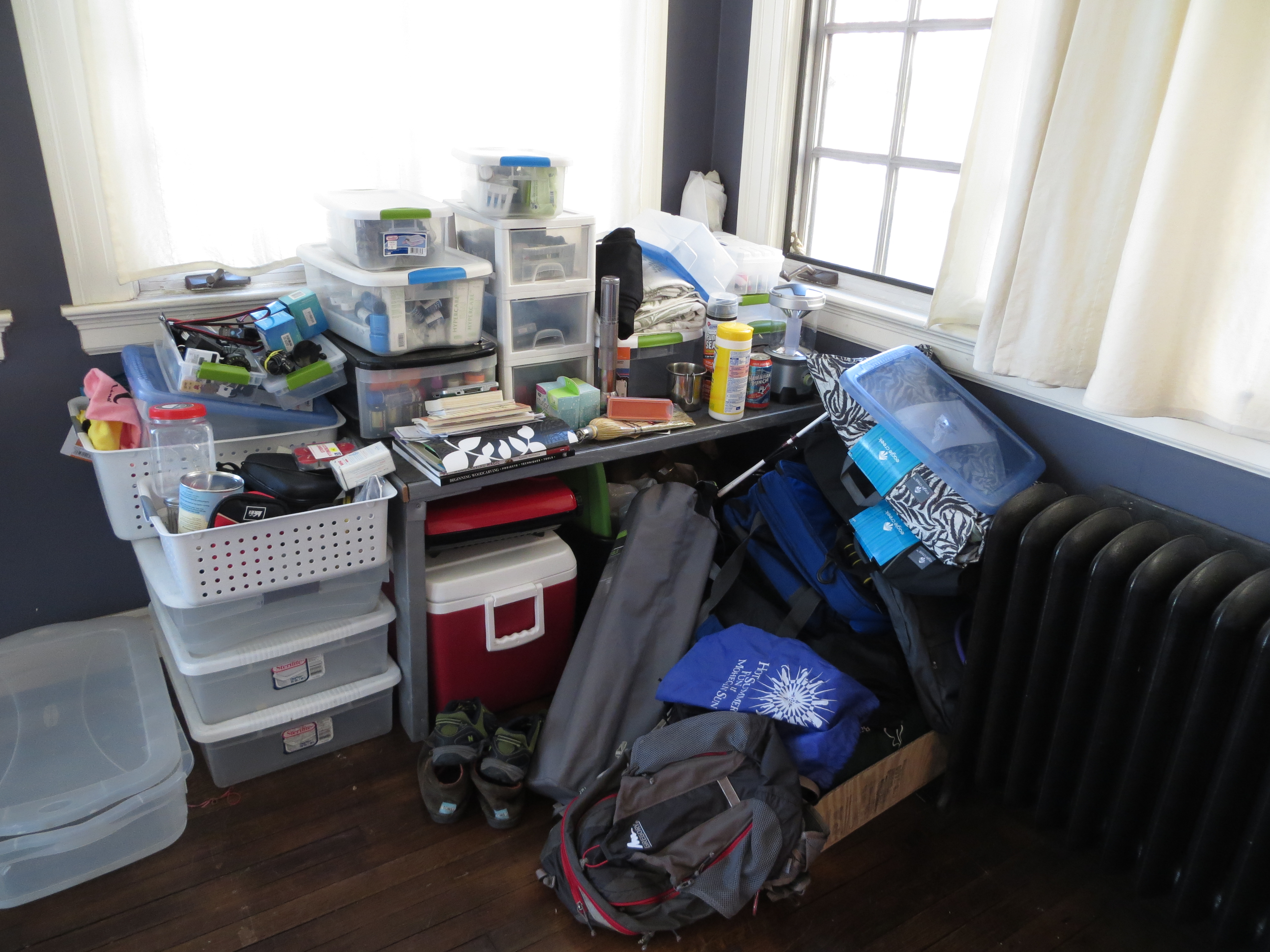 I sectioned off a corner in the sunroom months ago where I’ve been piling up all our gear. At first it was camping gear, then I gathered all our bathroom stuff, and then it was the kitchen, and now Tom has all his clothes packed. All in a heaping pile, with a sheet draped over it hiding it from nosey yard-salers. It’s time to unveil the treasures that rest there, time to fit everything into its proper bin or bag, the last stop before its final home in the truck.
