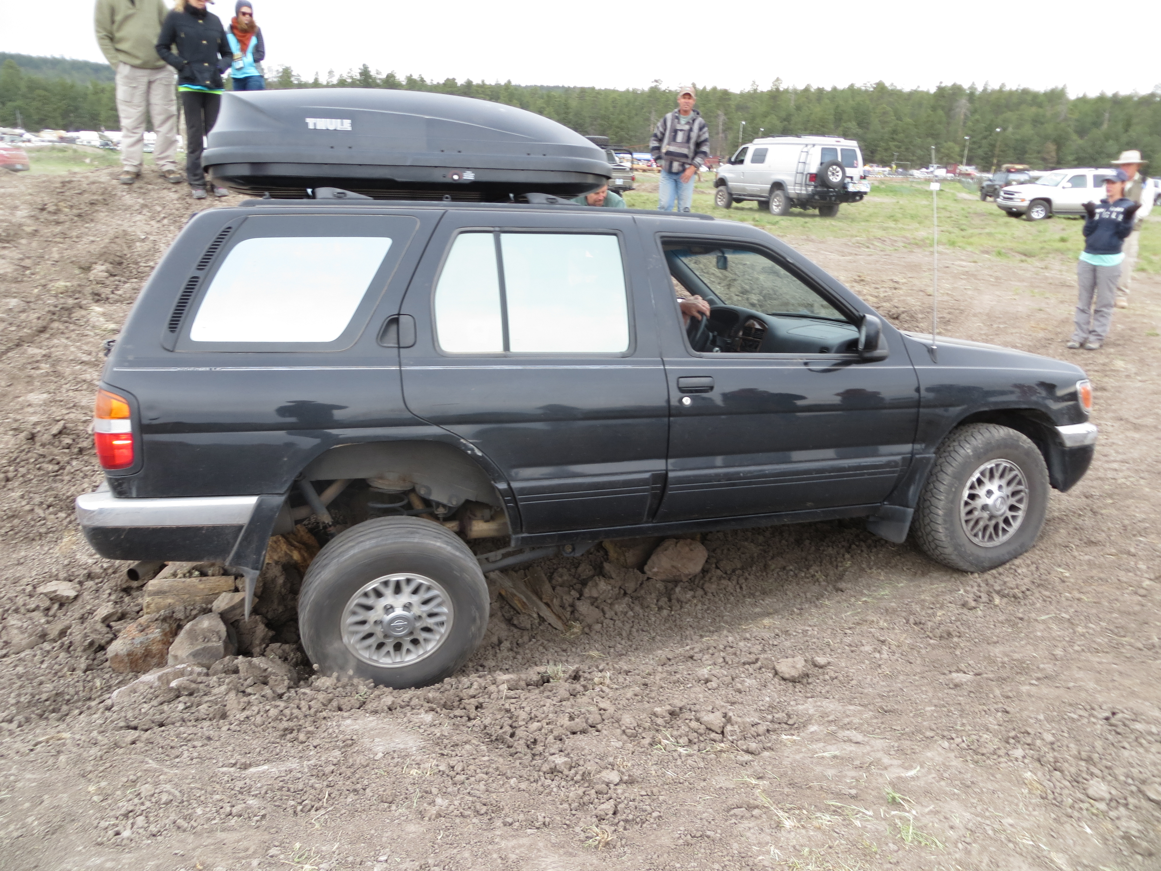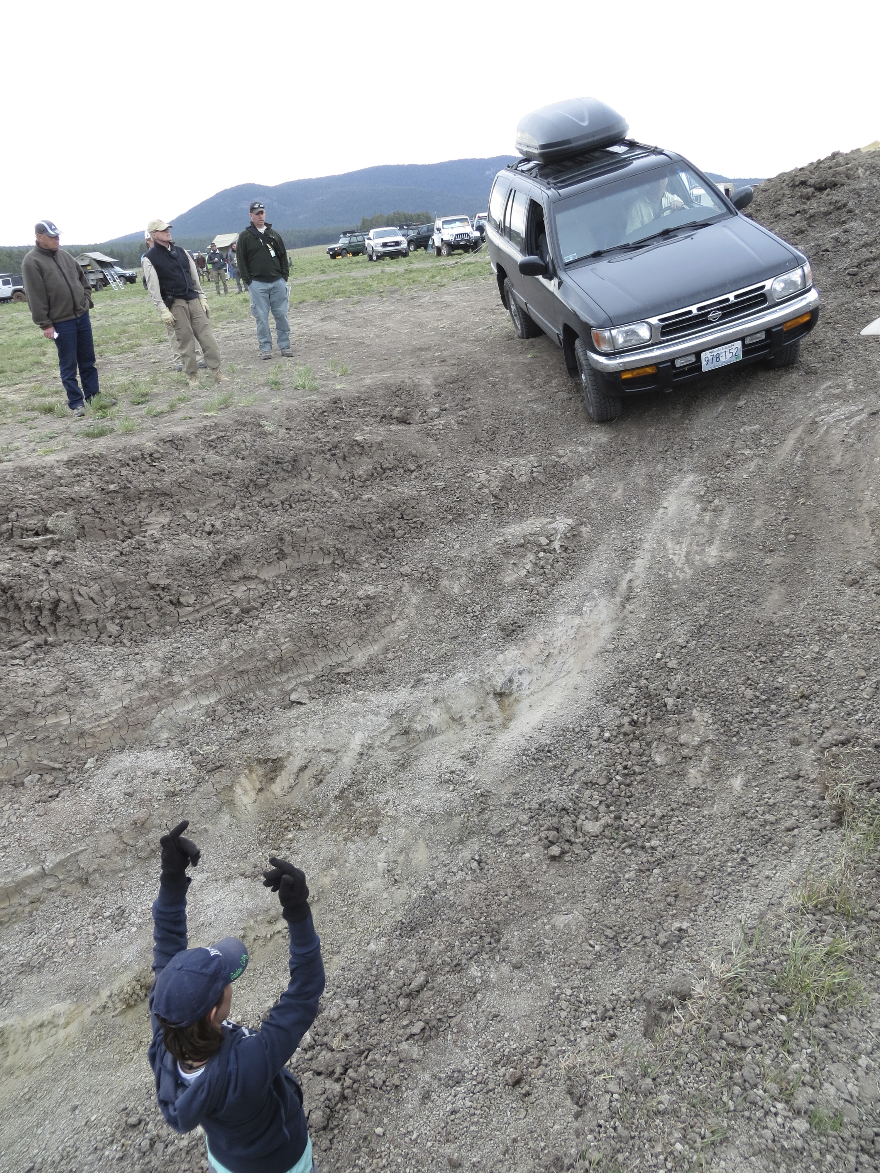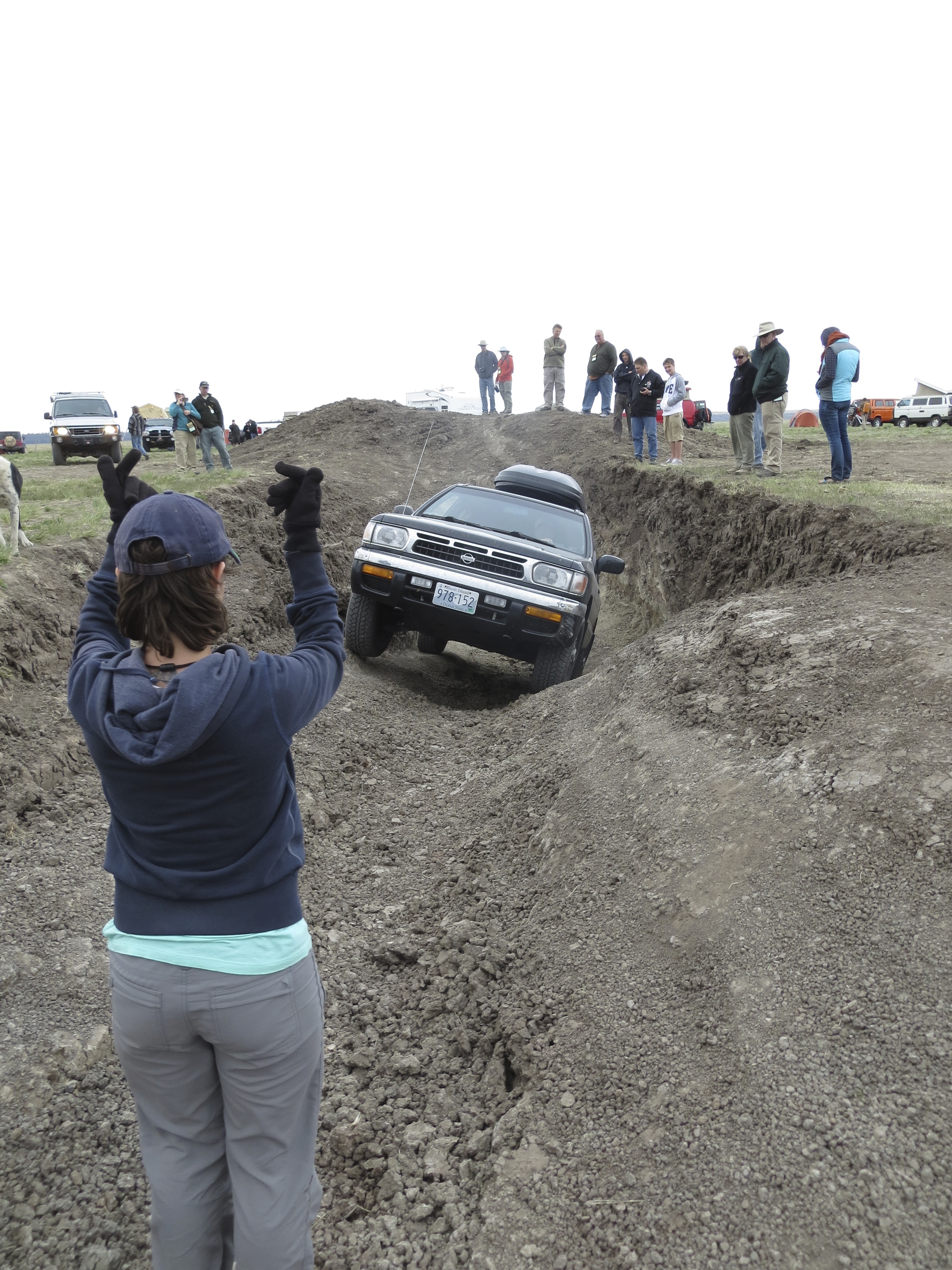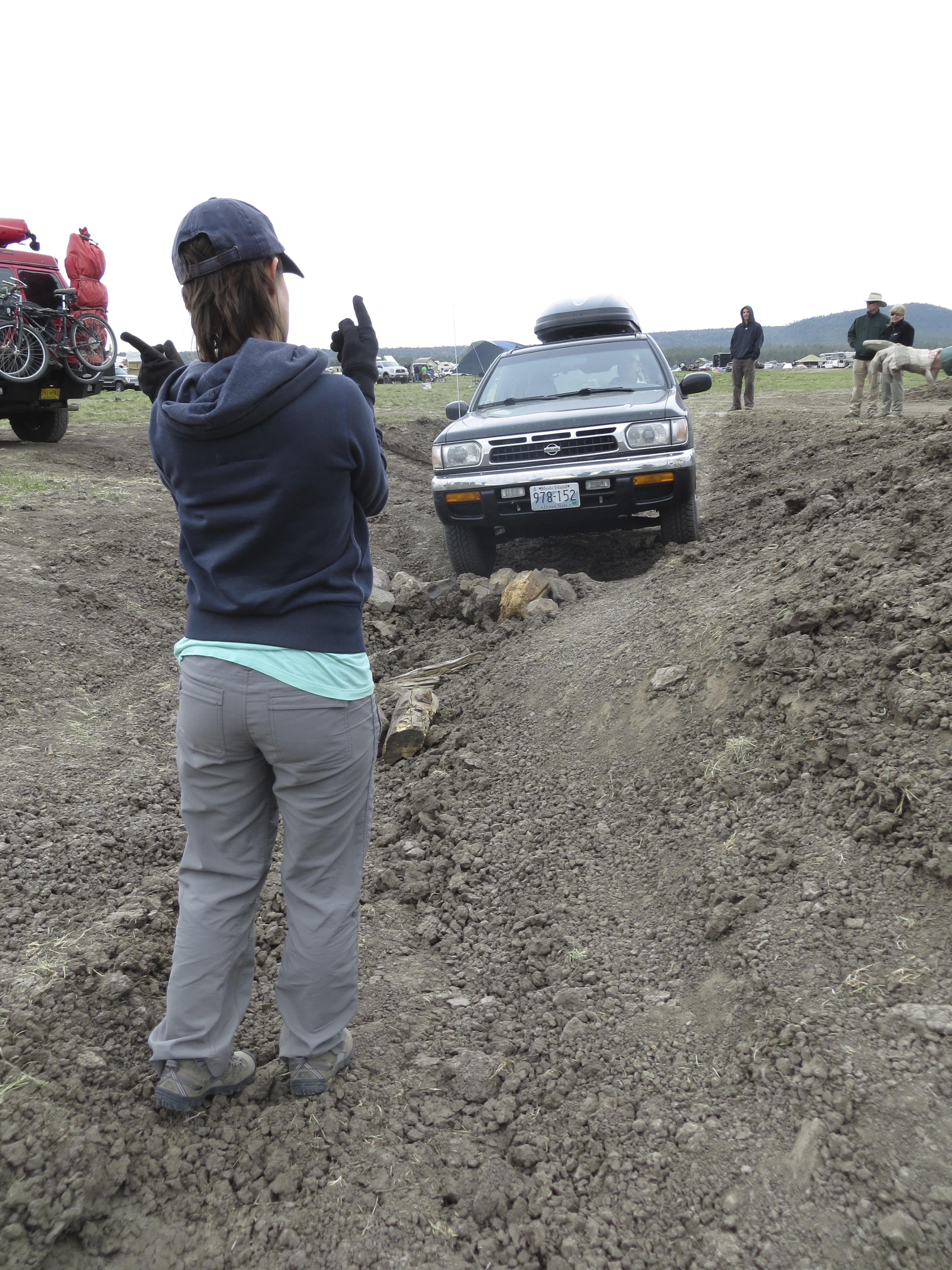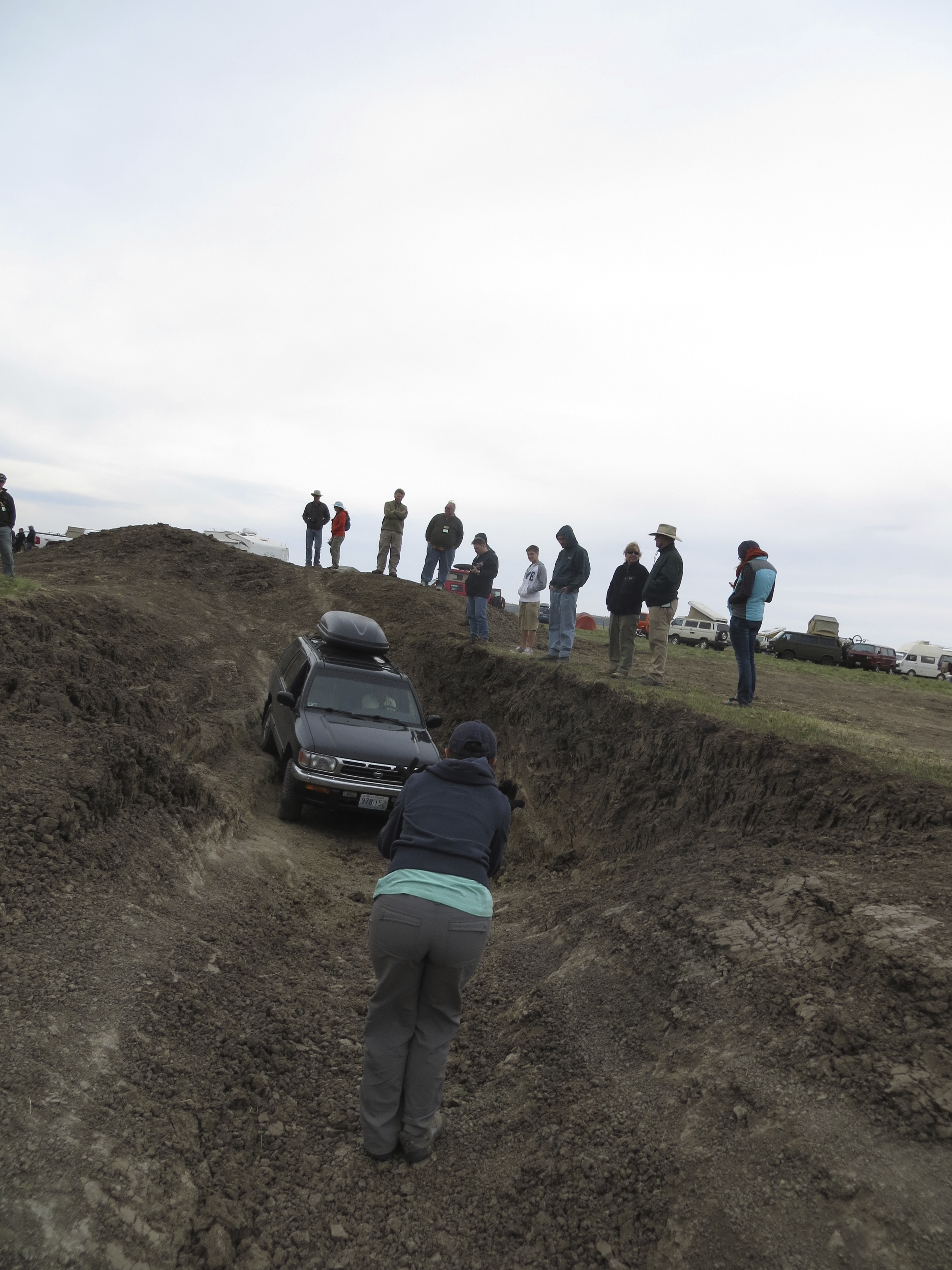 I waved Tom around the bend and as he pulled up I told him Owen told us to go for it, “Really?” he asked, “He says we’d be surprised” I said with a smile. As I slipped my way down the dirt ledge into the pit I read the trail and with Owen’s help, lead Tom forward. He slowly approached the pit and as he started over the ledge I bravely stood beneath him, arms as far upstretched as they would go, directing his tires to hit the correct spot to ensure he had traction on the decline and I wouldn’t be crushed to death by our home on wheels. Slowly he crept/slide down the ledge into the pit toward the wall, I directed him to turn the wheel slightly to avoid hitting the wall but maybe not enough as the front bumper scraped the dirt, “Oh well, that’s why they call them bumpers” I yelled to the crowd watching us. As Tom straightened out the wheel I tried to figure out how I was going to bring him up and out of this pit without slashing a sidewall, or two. I crawled him up onto the ledge with the passenger tires and as I kept him moving forward I saw the whole truck tilt to one side, wheels off the ground and I was in awe, then … I fell. Right down into the dirt with a 5,000 lb truck hanging over me. As I scrambled to my feet happy that my partner is patient and capable of taking marshaling directions without going forward on his own, I yelled, “Right, when you can’t see me, that means STOP!” We all laughed as I backed up a few more feet and waved Tom forward some more. Owen said something about correcting his tires but I felt confident that he was on a good line so I kept him moving forward and before we knew it everyone was back on even ground and we all, including Gwen, were in one piece! Tom and I were so overcome with joy we didn’t stop smiling all the way though dinner.