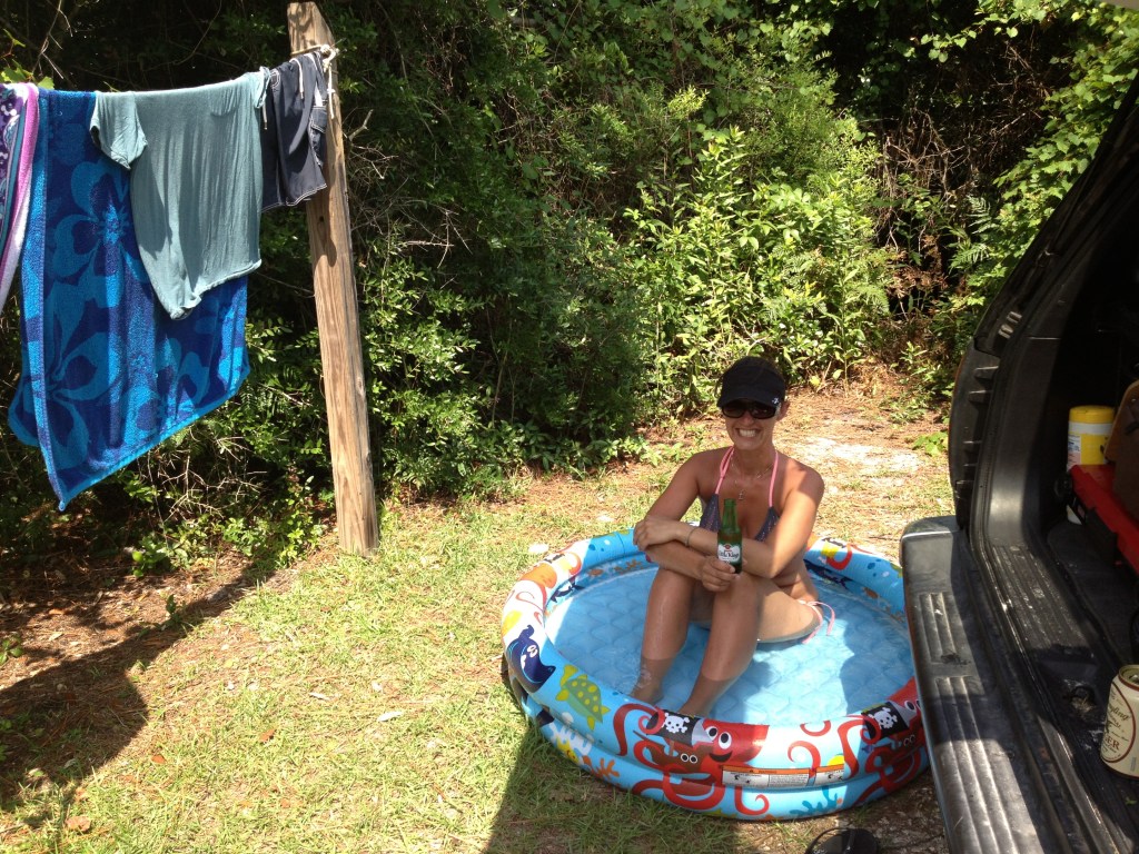 In the morning we had plans to meet my childhood best friend who had just moved out there. We packed up early and headed to Perdido Key where we soaked up the sun and friendly company for a couple of hours. What a great beach, I highly recommend it to anyone looking for a quiet beach with easy parking; it’s also a National Park so we got in for free! I really enjoyed the time spent with Erin; when we were kids we used to spend as much time as possible at her family’s beach house, so to lounge on the beach with the adult her while so far away from home and everyone I know was heartwarming in a way I didn’t expect. After a few hours of baking in the sun we said our goodbyes and Tom and I decided we should just find camp. Once we were at our site at Big Lagoon SP we quickly realized we wouldn’t be able to relax as planned because the sun was so hot and the air so thick with humidity, I didn’t even want to walk the 15 minutes to the swimming hole! I had been ‘joking’ about getting a pool for a while now and today we had a serious conversation about the logistics of it. Once worked out, we drove to Walmart to spend our gift certificate on a 2-ring, inflatable kiddie pool. 😀 It took 4 trips with the solar shower to fill the pool which was well worth it! We sat squeezed in the tiny pool until the sun went down. Something about sitting in that cool water with my [new] favorite beer (Little Kings; how cute!), the love of my life, and an awesome Pandora station that made me feel like the happiest, most luckiest girl in the world!