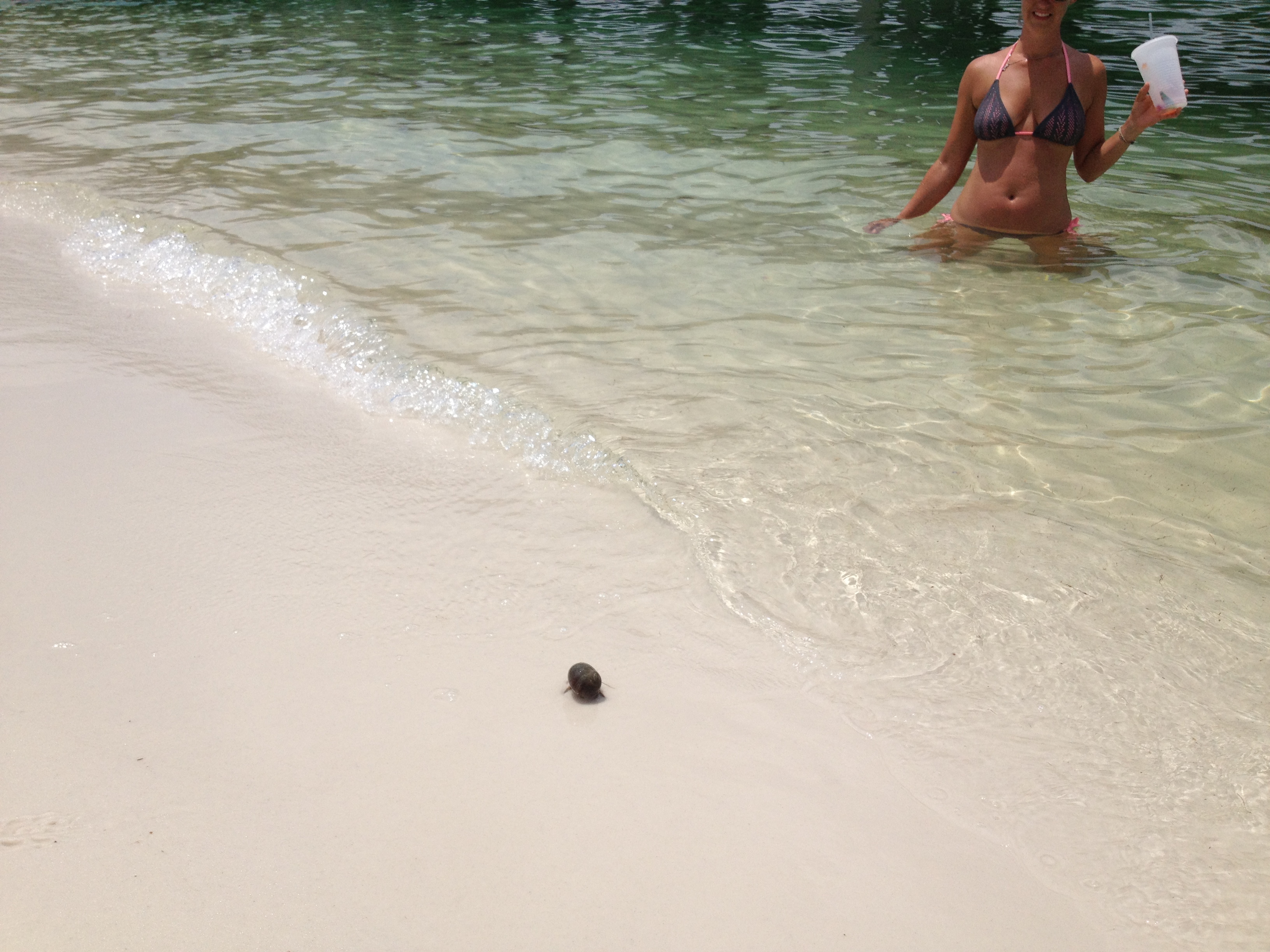 Tom followed me up the ladder and I stumbled my way over to the bucket and dipped my mask in. As I stood, I realized I needed to get off this rocking boat immediately or risk a horrible case of sea-sickness. I put all my gear back on and jumped over into the rough sea. I swam around a bit but it was too late, I was queasy and the amount of swimming required to keep myself in front of the boat was proving to be too much. I would let myself float until even with the stern then would kick and paddle as hard as I could until I was… well, nowhere. I couldn’t move my body against the current, no matter how I tried I kept floating back. I finally gave into the power of the sea and joined the amateurs hanging onto the anchor line and stole glimpses at my neighbor’s watch, groaning with the realization that I still had another 45 minutes of this to endure. I tried my best to keep my composure, I marveled at the school of fish swimming around my head, bumping my mask. I tried to believe that the chum they were frantically after was some sort of food and not a fellow human’s stomach bile. I tried to look around for Tom or my parents but every time I lifted my head from the water the nausea increased. I floated and tried to quiet my mind.
