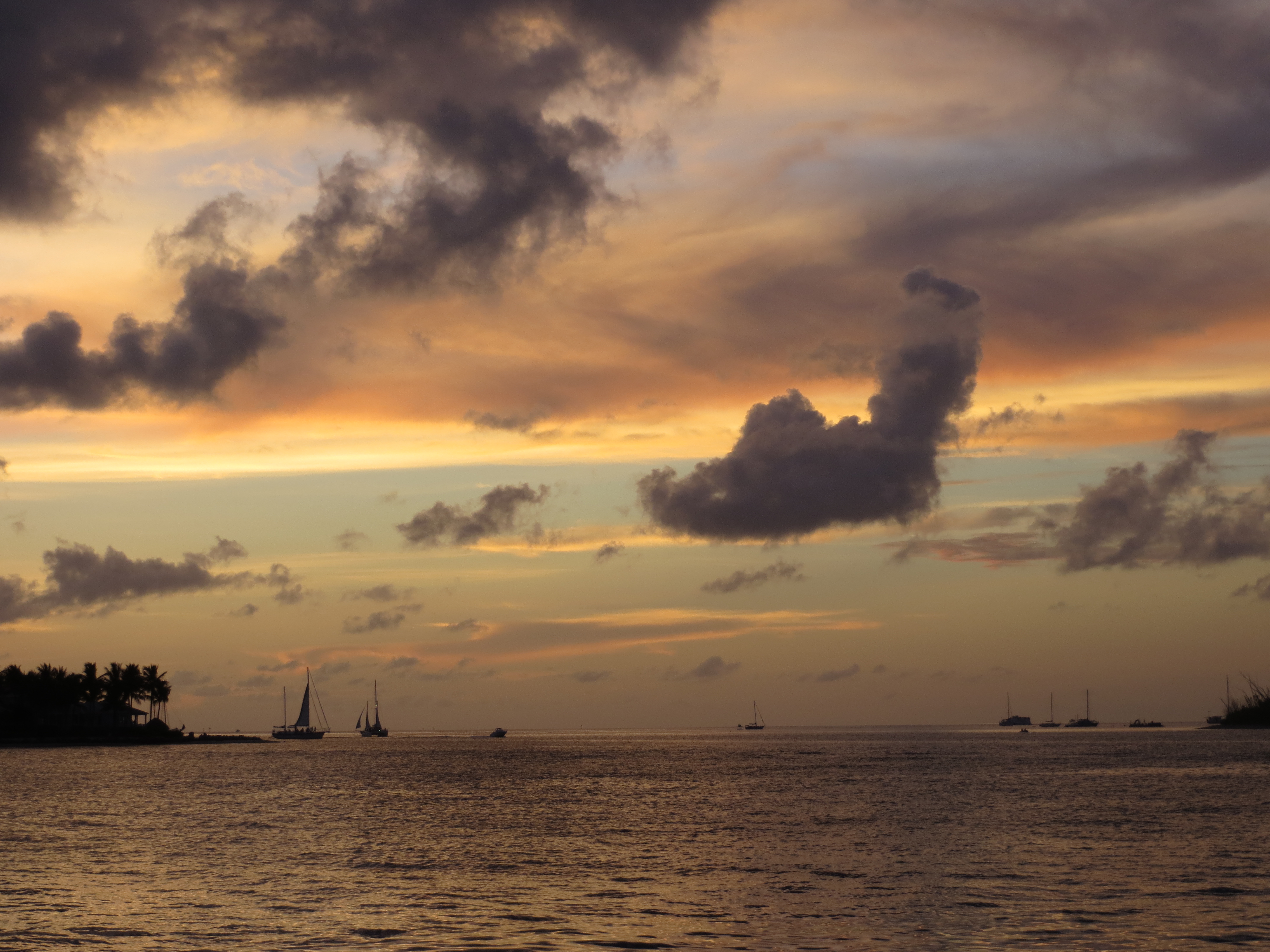 We drove down to Key West and walked around for a few hours before heading back up to get a site at Bahia Honda SP. We were right on the water which was good because it was H.O.T! I went for a dip but the “No Swimming” signs taunted me so I got out my pool and filled it. Tom handed me my new, super cool, purple rum sippie and I laid in the cool water watching the sun slowly make a downward arch in the sky. I was in a heat induced stupor when all of a sudden I realized the sun was setting! Quickly I dried and got dressed and we raced back down towards Key West. Suddenly the sky got dark as night and rain started flowing as if someone had sliced a hole in the swollen clouds’ undersides. Luckily we had seen enough Florida weather to know not to worry, this could all be (and probably was) just a passing “shower”. Instead we worriedly watched the minutes click upwards on the clock, sunset was at 8:20 and it was already 7:52 and we were only on Summerland Key! By 8:05 we were crossing the final bridge into Key West, the rain had cleared and we could tell that the sunset was beautiful… at Mallory Square which we were still a good 15 minutes from!