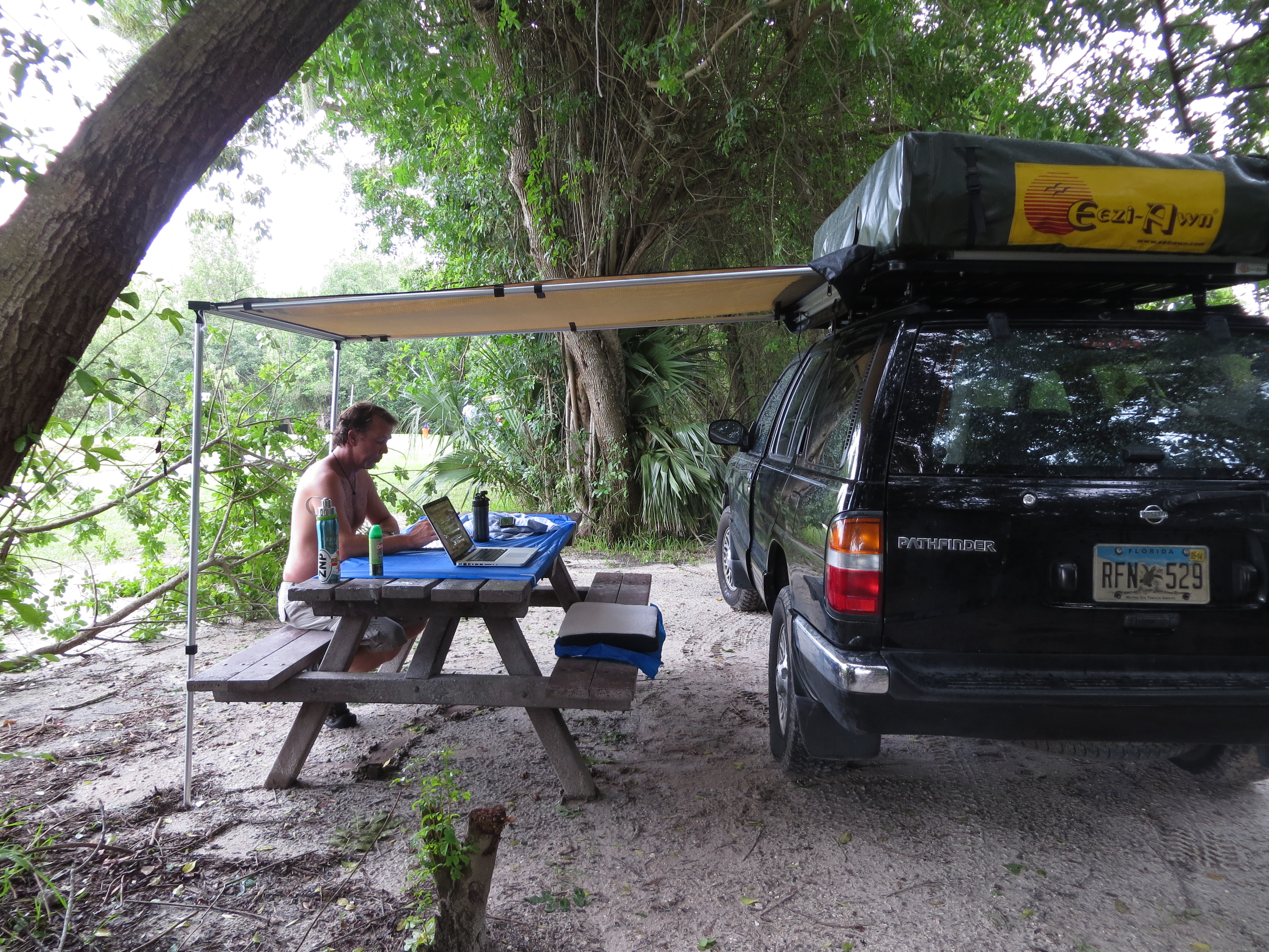 We drove towards our 1st free campground, not sure what to expect, but surely weren’t expecting much. Boy were we surprised when we saw flush toilets, showers, picnic tables (eventually we realized ours was the only site with a table) and it was really, actually free! (Blue Cypress Lake, Yeehaw Jct, FL) We set up in a little alcove of trees, pulling the awning over the picnic table we sat and enjoyed the wonderful breeze coming off of the water, it was so cool here!