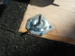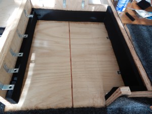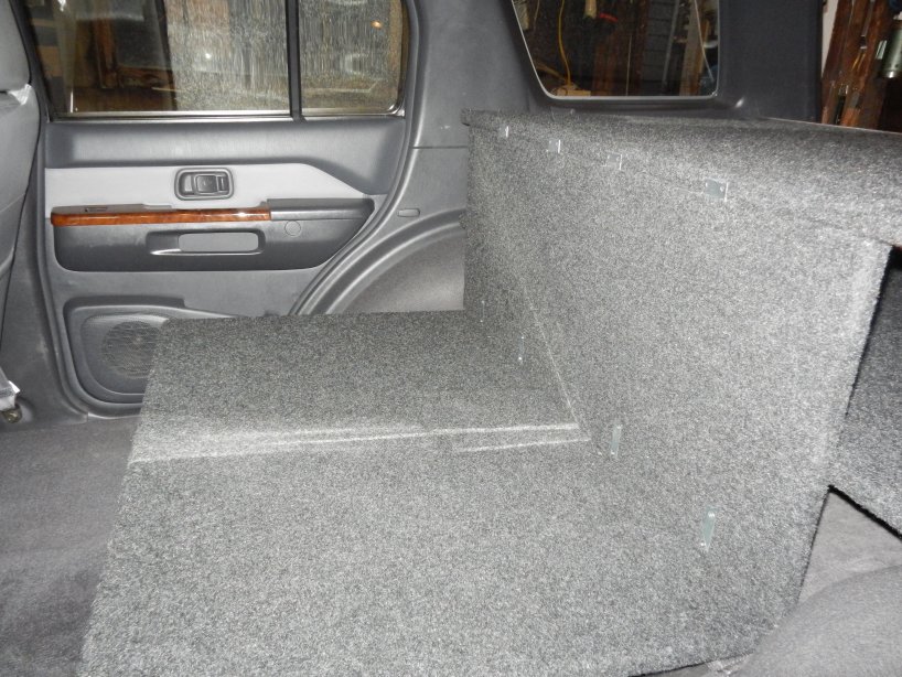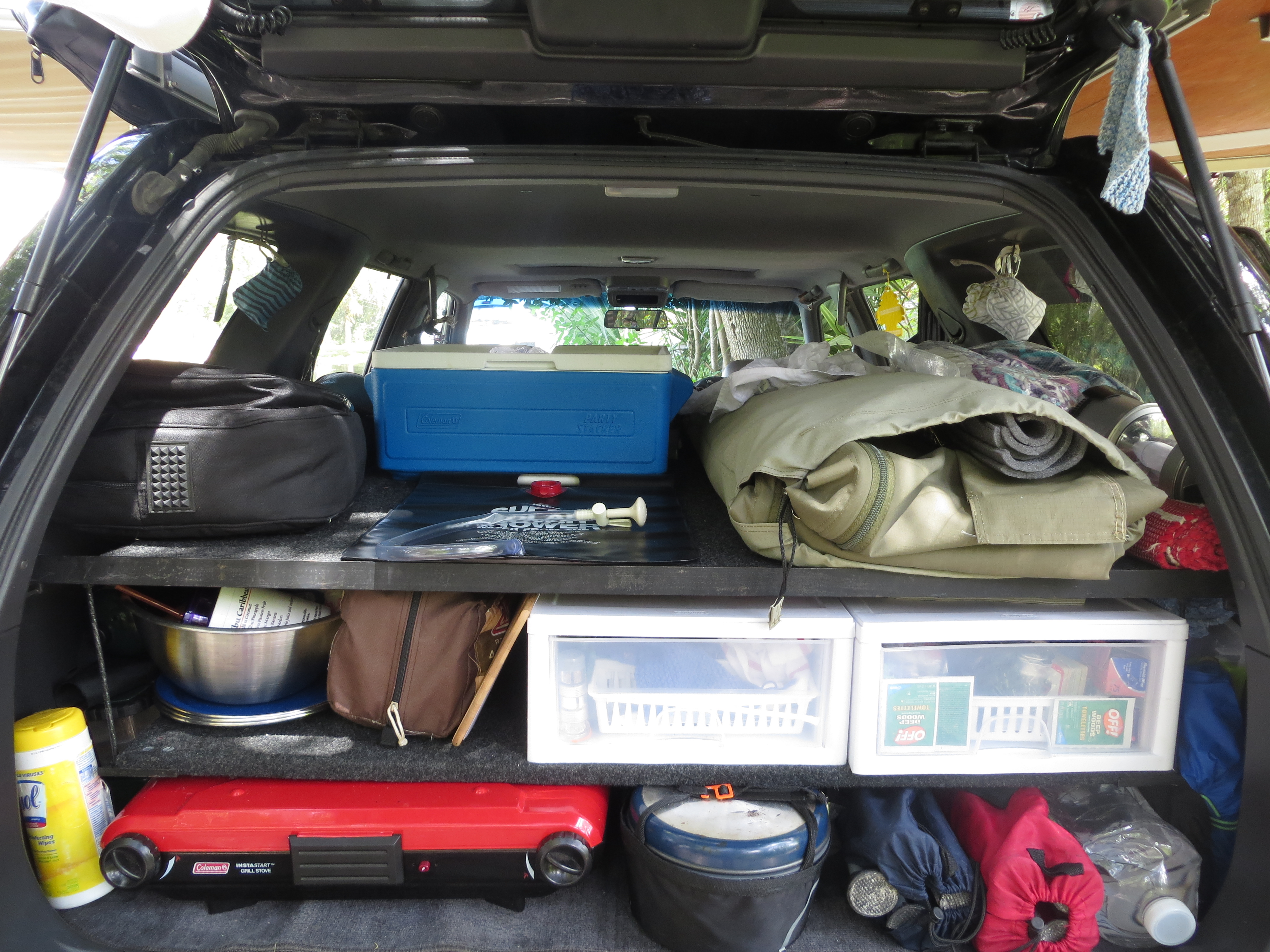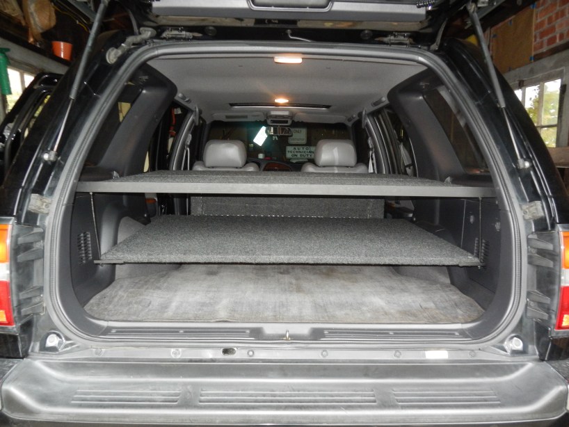 When we first planned this we were going to take Tom’s Jeep Liberty and we had pretty much finished outfitting it for the trip. When we bought Gwen, we had a fresh slate and what worked in the Jeep was never considered for the Pathfinder. In the Jeep we had built a platform to cover the storage below; it was no more than plywood with 2×4 legs covered with gym flooring. It fit the Jeep and provided a place to put things whilst rifling through the contents of the storage below. Tom had also figured out that we could prop a piece of plywood under the lip of the life gate to create a table. Where the back seats were he made a platform for the fridge to sit on and constructed a lock box for the floor.